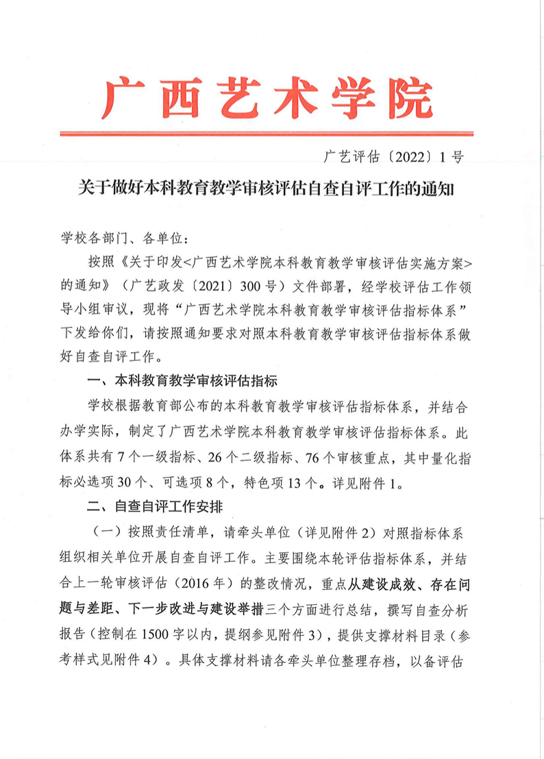 广艺评估〔2022〕1号关于做好本科教育教学审核评估自查自评工作的通知