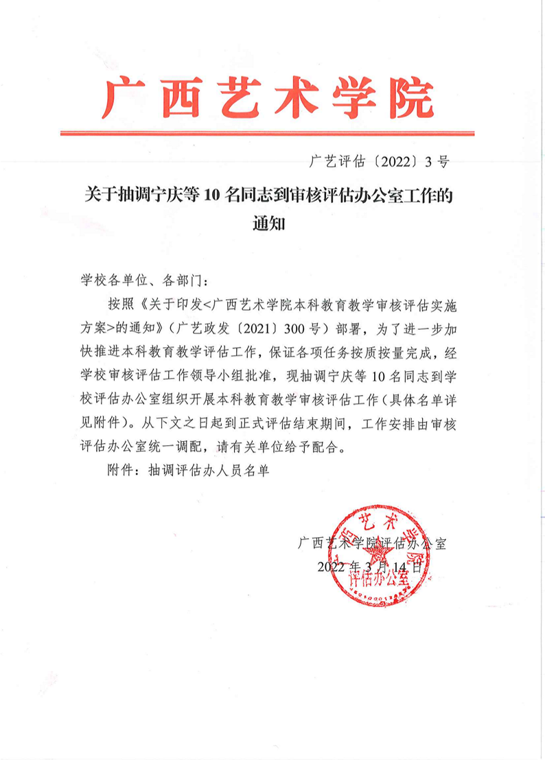 广艺评估〔2022〕3号关于抽调宁庆等10名同志到审核评估办公室工作的通知