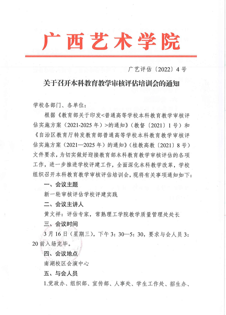 广艺评估〔2022〕4号关于召开本科教育教学审核评估培训会的通知