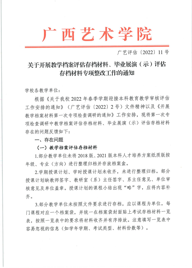 广艺评估〔2022〕 11号 关于开展教学档案评估存档材料、毕业展演(示)评估存档材料存档材料专项整改工作的通知