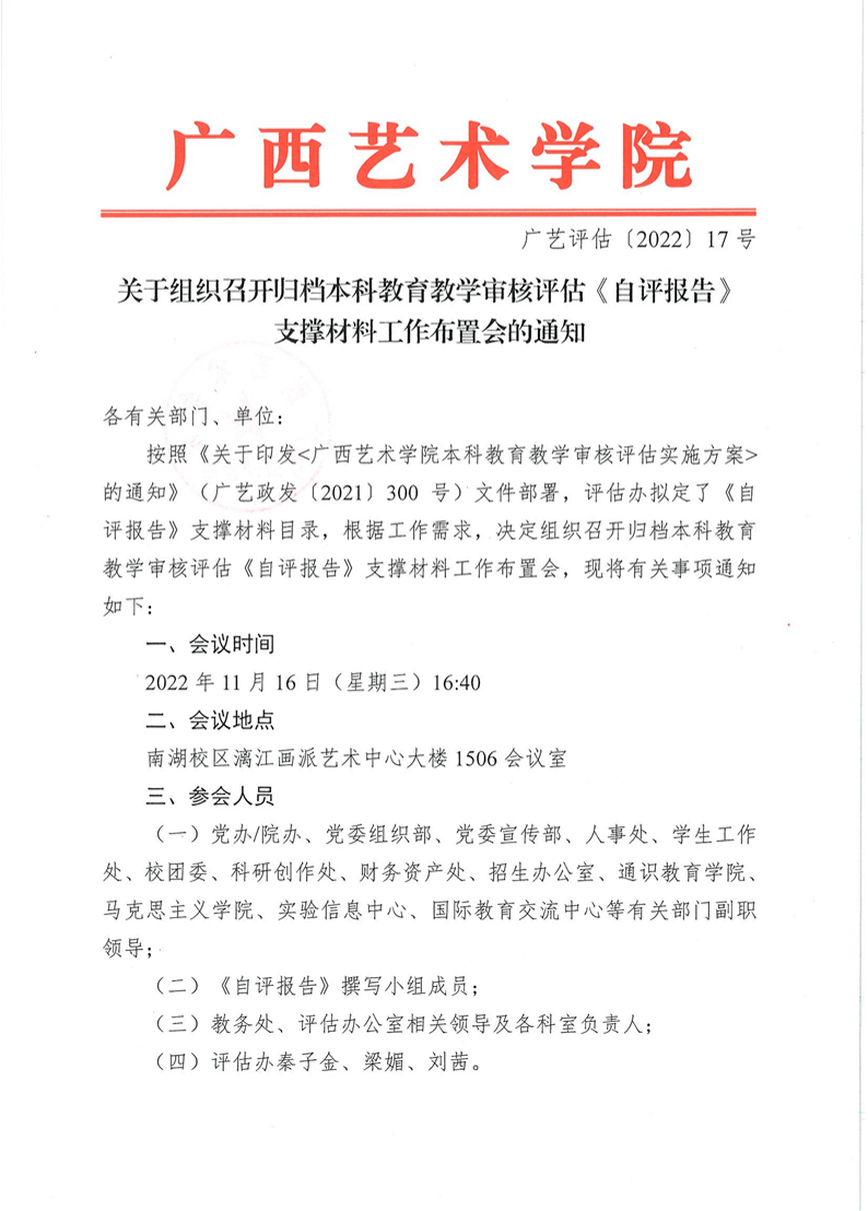 广艺评估〔2022〕17号关于组织召开归档本科教育教学审核评估《自评报告》支撑材料工作布置会的通知 来源: 发布时间:2022-11-16 11:38:30 浏览次数: 次 【字体:小 大】 分享到: 【打印正文】