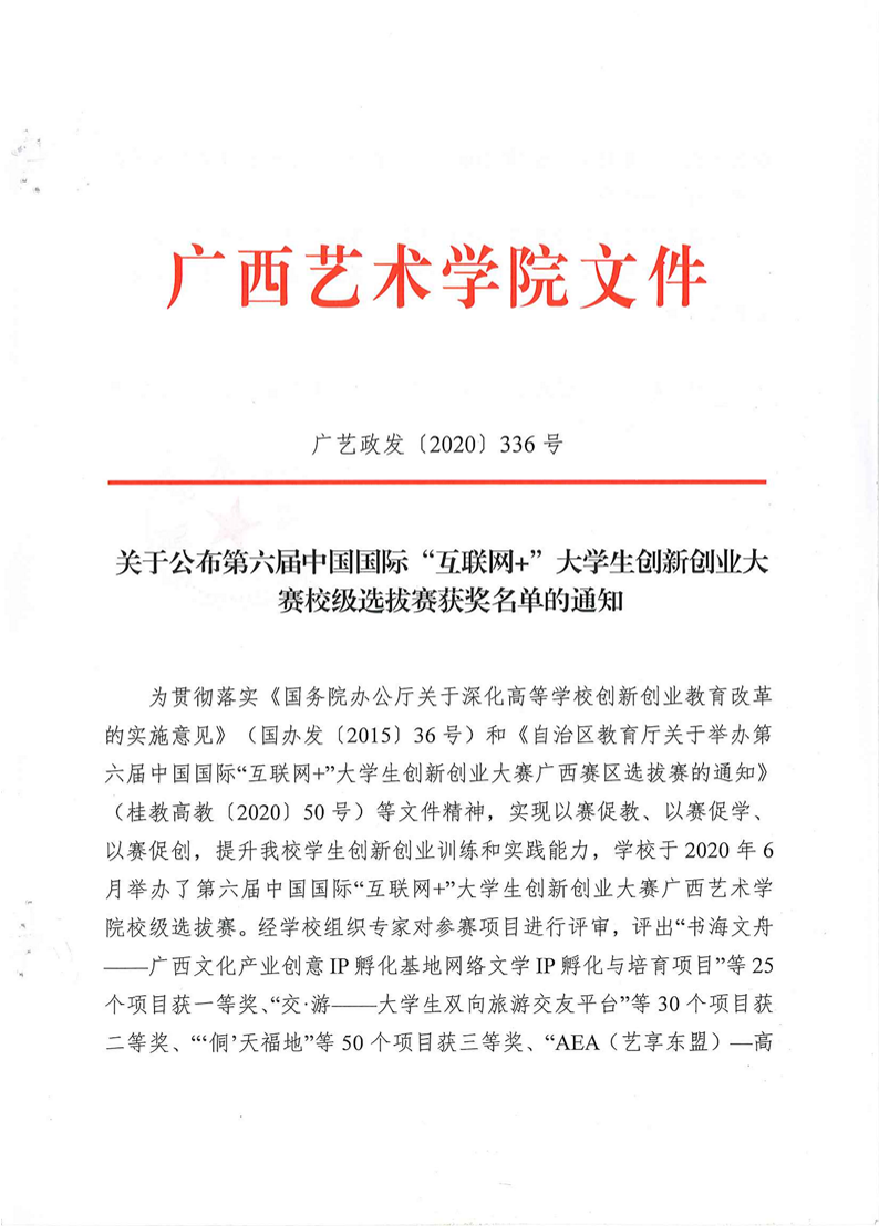 广艺政发〔2020〕336号 关于公布第六届中国国际“互联网+”大学生创新创业大赛校级选拔赛获奖名单的通知