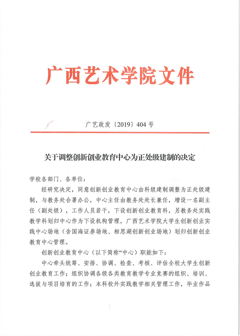广艺政发〔2019〕404号关于调整创新创业教育中心为正处级建制的决定