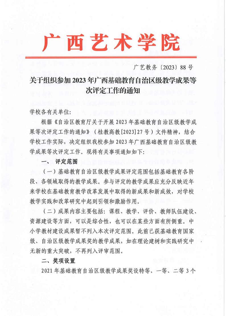 广艺教务〔2023〕88号 关于组织参加2023年广西基础教育自治区级教学成果等次评定工作的通知