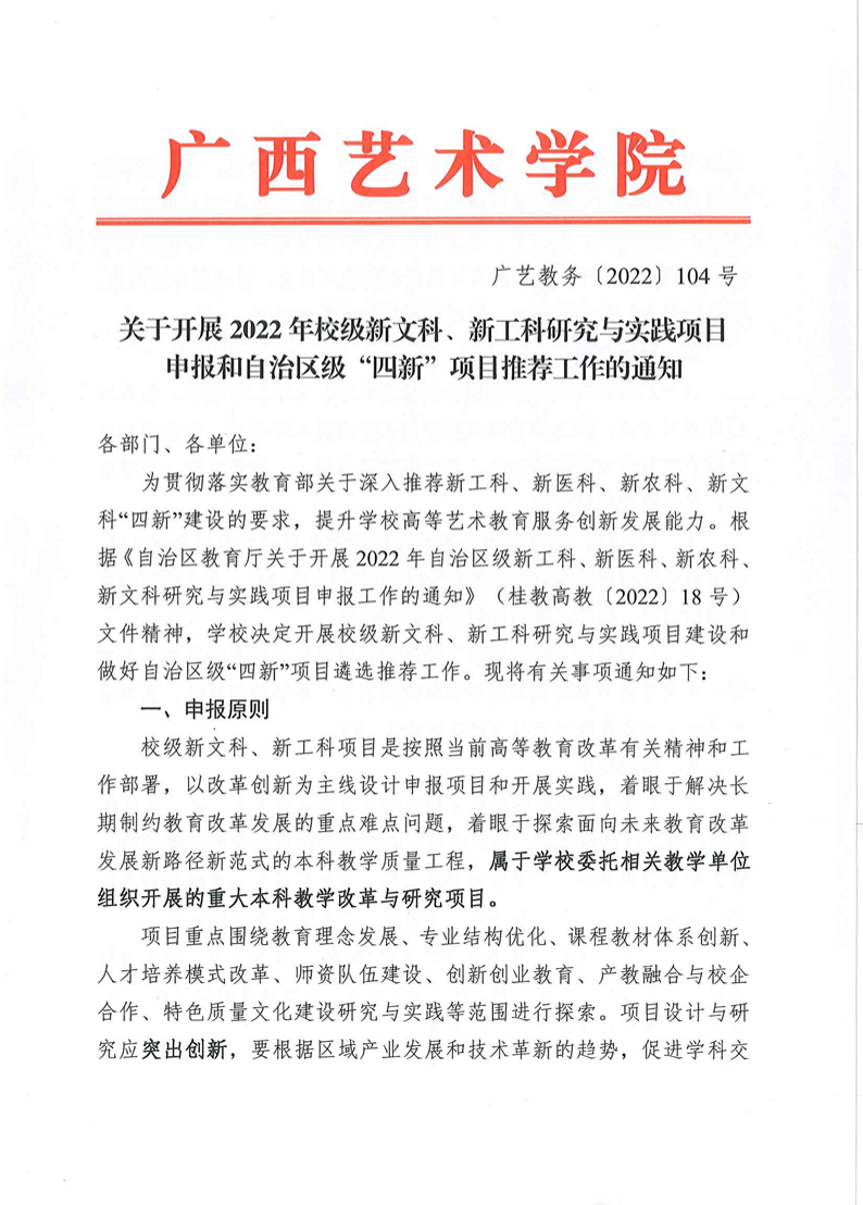 广艺教务〔2022〕104号 关于开展2022年校级新文科、新工科研究与实践项目申报和自治区级“四新”项目推荐工作的通知