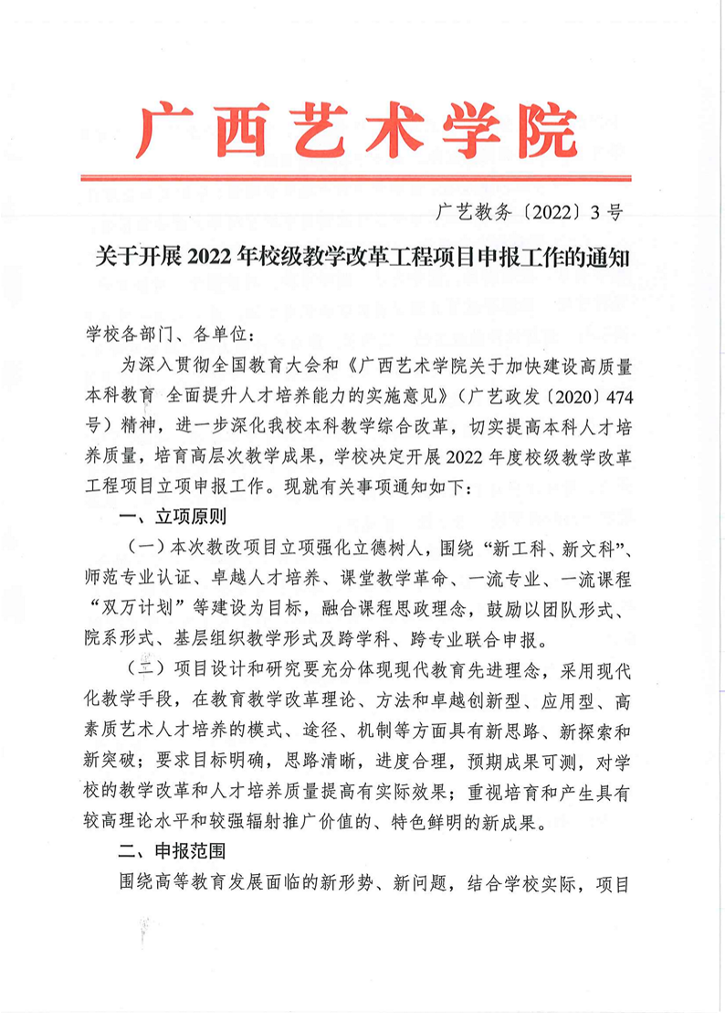 广艺教务〔2022〕3号 关于开展2022年校级教学改革工程项目申报工作的通知 来源: 作者: 时间:2022-01-06 10:22 点击:次 字号:【小 大】 附件12022年度校级教改项目申报汇总表.xlsx附件22022年度fun88乐天使高等教育教学改革工程立项项目申请书.doc 分享到: 打印正文 返回顶部
