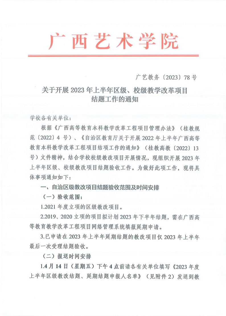 广艺教务〔2023〕78号 关于开展2023年上半年区级、校级教学改革项目结题工作的通知 来源: 作者: 时间:2023-04-13 18:54 点击:次 字号:【小 大】 附件2.2023年度上半年区级教改结题、延期结题申报人名单.xls附件4.fun88乐天使教改工程项目结项申请表.docx附件5.fun88乐天使校级教改项目申请结题汇总表.xls附件6.教学改革系统变更-结题使用说明文档.docx附件3.广西高等教育本科教学改革工程项目结项申请表(1).docx 分享到: 打印正文 返回顶部