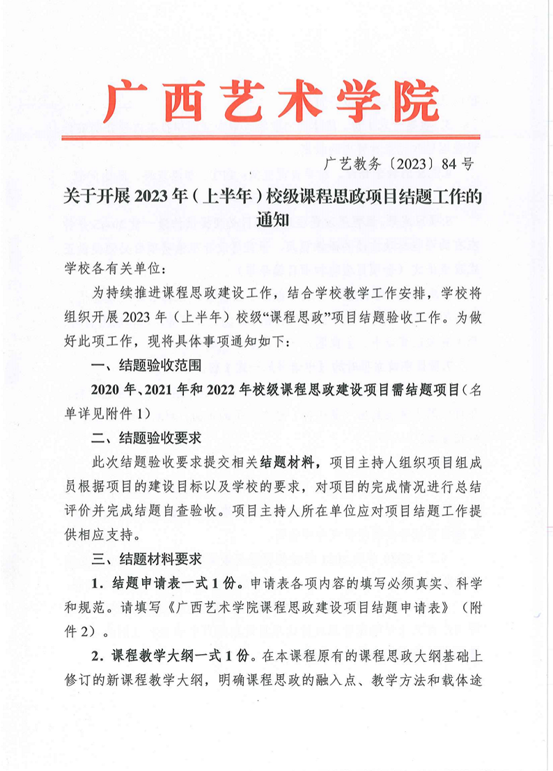 广艺教务〔2023〕84 号 关于开展2023年(上半年)校级课程思政项目结题工作的通知