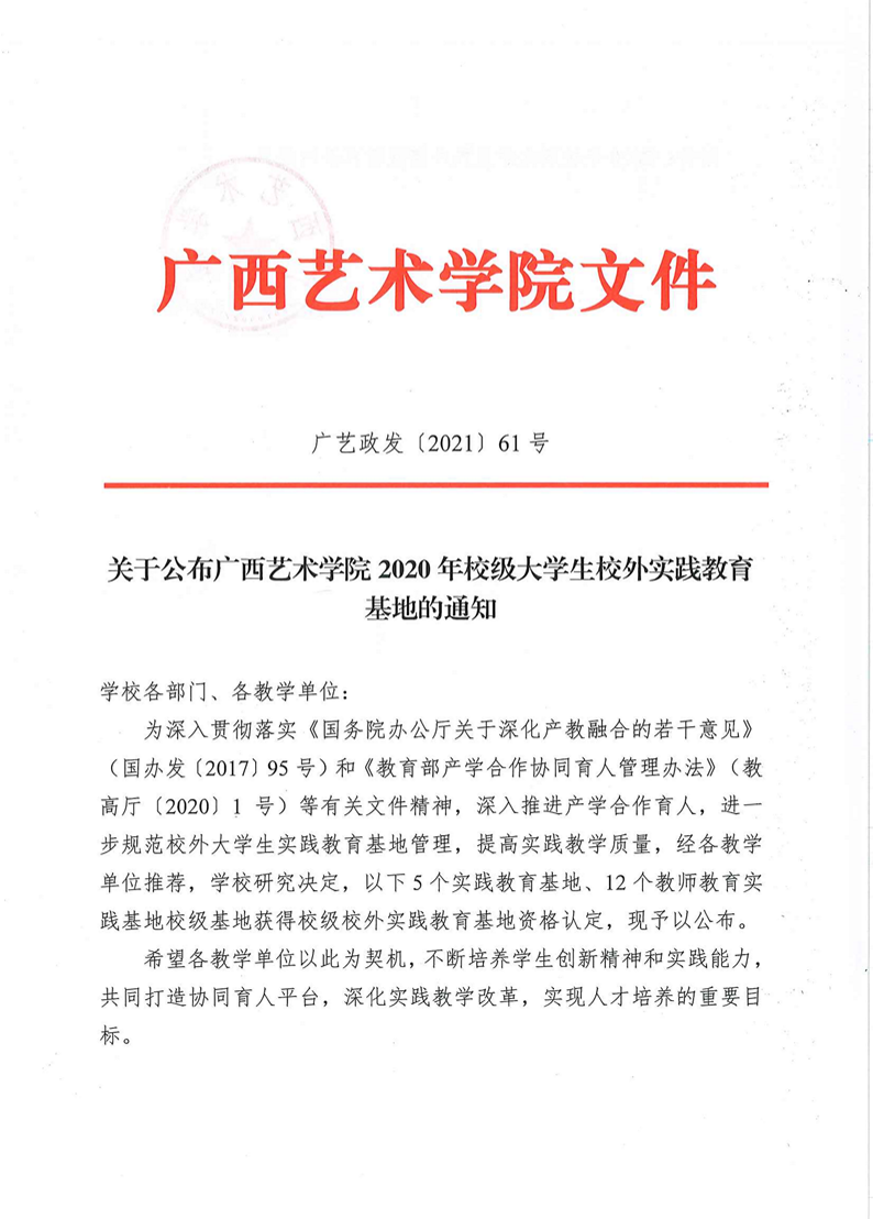 广艺政发[2021]61号关于公布fun88乐天使2020年校级校外实践教学基地的通知